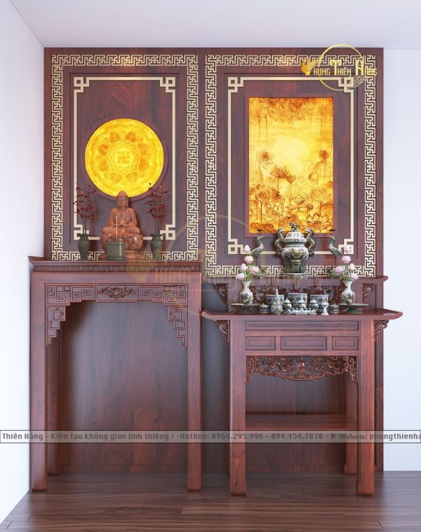 Đây là sản phẩm tinh tế được thiết kế bởi Phụng Thiên Hằng, kết hợp hài hòa giữa yếu tố phong thủy và nghệ thuật truyền thống. Với sự trân trọng văn hóa Phật giáo và thờ cúng tâm linh, không chỉ mang lại không gian trang trọng, thanh tịnh mà còn thể hiện sự thẩm mỹ và tinh tế trong từng chi tiết. Đây chính là lựa chọn lý tưởng cho những ai mong muốn một không gian thờ cúng trang nghiêm và có giá trị lưu truyền theo thời gian.