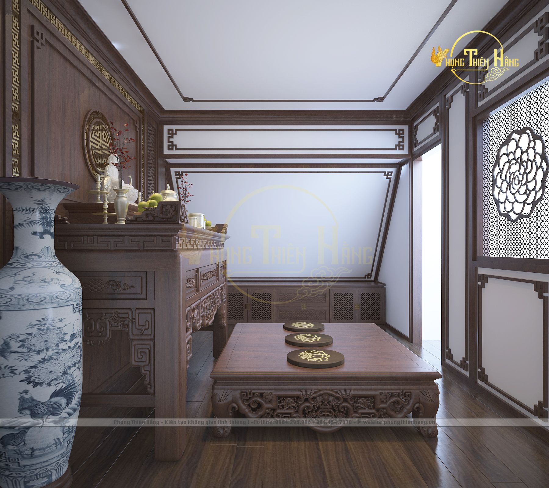 Đây là sản phẩm tinh tế được thiết kế bởi Phụng Thiên Hằng, kết hợp hài hòa giữa yếu tố phong thủy và nghệ thuật truyền thống. Với sự trân trọng văn hóa Phật giáo và thờ cúng tâm linh, không chỉ mang lại không gian trang trọng, thanh tịnh mà còn thể hiện sự thẩm mỹ và tinh tế trong từng chi tiết. Đây chính là lựa chọn lý tưởng cho những ai mong muốn một không gian thờ cúng trang nghiêm và có giá trị lưu truyền theo thời gian.
