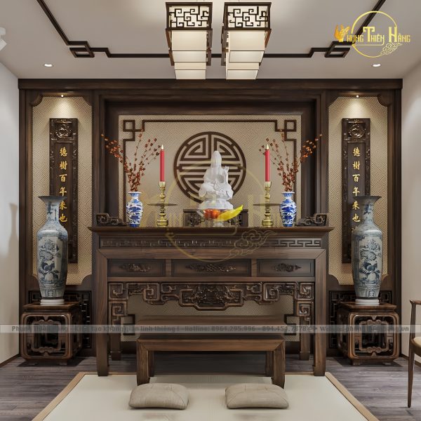 Đây là sản phẩm tinh tế được thiết kế bởi Phụng Thiên Hằng, kết hợp hài hòa giữa yếu tố phong thủy và nghệ thuật truyền thống. Với sự trân trọng văn hóa Phật giáo và thờ cúng tâm linh, không chỉ mang lại không gian trang trọng, thanh tịnh mà còn thể hiện sự thẩm mỹ và tinh tế trong từng chi tiết. Đây chính là lựa chọn lý tưởng cho những ai mong muốn một không gian thờ cúng trang nghiêm và có giá trị lưu truyền theo thời gian.